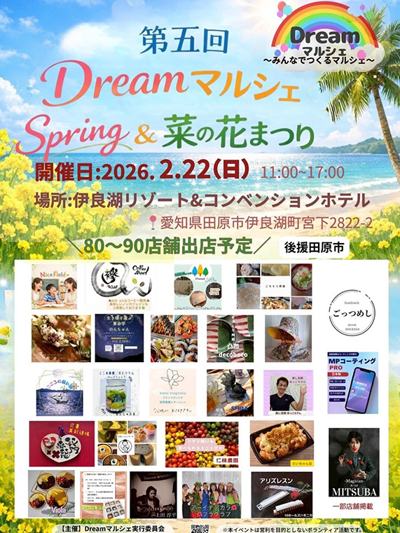 「渥美半島 菜の花まつり」とのコラボ開催で更なる盛り上がりをみせる5回目のドリームマルシェ。美味しいグルメやスイーツ、手作り雑貨や占い、マッサージなど素敵なブースが今回もたくさんあるよ♪ 南国気分でお買い物を楽しんでみて。