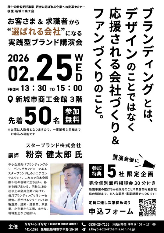 ブランディングとは、デザインのことではなく応援される会社づくり&ファンづくりのこと。全国の企業・お店のブランディングを手がけてきた粉奈健太郎氏によるエンタメ性あふれる講演会。多くの事例と実践で役立つ視点からの「小さな会社こそ実践できるブランド戦略」を聞いてみよう。