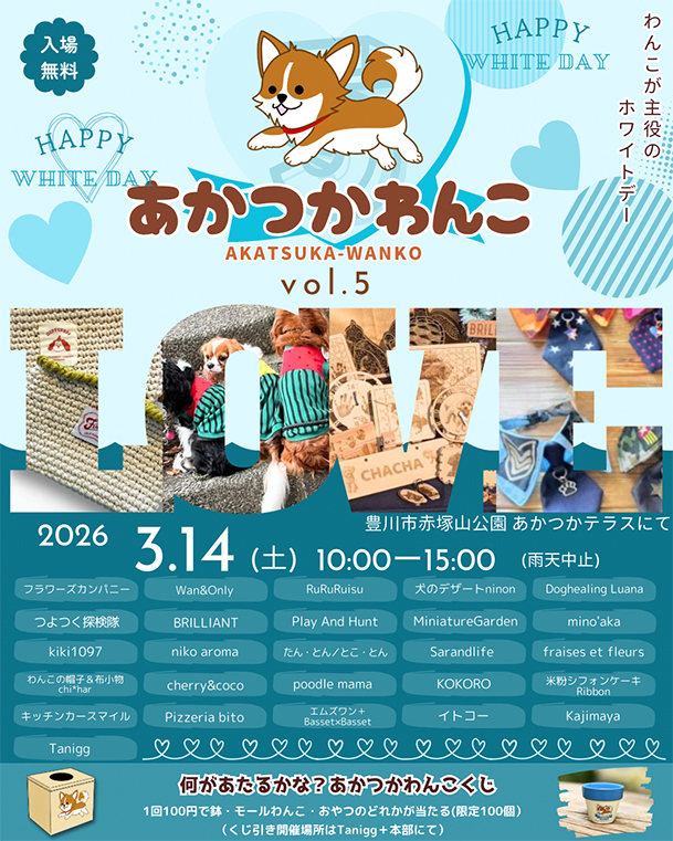 3/14に、わんこが主役のホワイトデー「あかつかわんこ5」開催! 26店舗のわんこグッズや美味しいものが勢ぞろい。鉢・モールわんこ・おやつのどれかが当たる、恒例のあかつかわんこくじやフォトスポットも♪わんこと一緒に、のんびり楽しめるイベントへ足を運んでみて。
