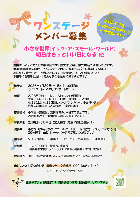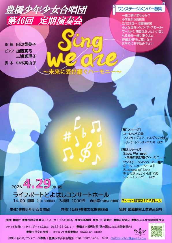 豊橋唯一の子どもだけの合唱団「豊橋少年少女合唱団」の定期演奏会「Sing, we are ~未来に受け継ぐハーモニー~」。小2~高3まで約30人の団員と、ワンステージメンバーで歌います。第2ステージは「この先もずっと合唱団の歌声が続きますように!」という思いを込め、合唱団の魅力を様々な歌で伝えるミュージカル仕立てのステージ。ワンステージメンバーも募集しているので、歌が好きな子必見! かけがえのない瞬間を紡ぐ子供たちのステージを体感しに、ぜひ足を運んでみて。