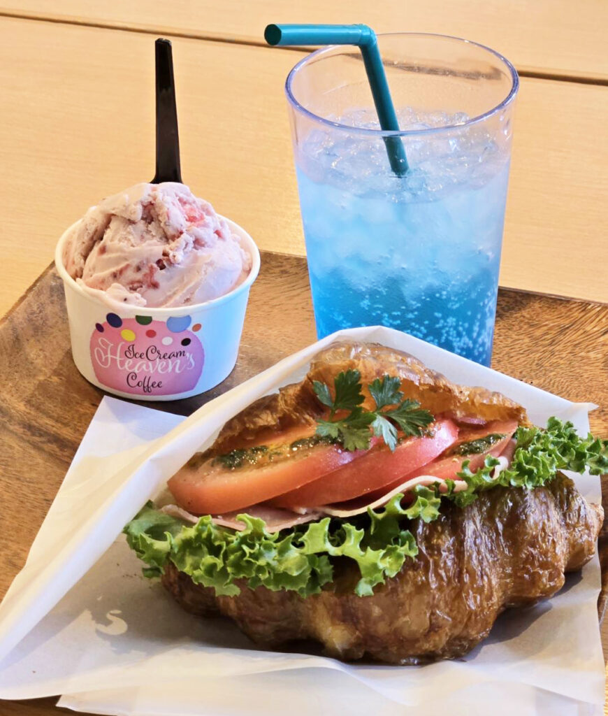 クロワッサンサンドは、生ハム・トマト・レタスをCHOICE。具材が溢れるほどのボリュームで野菜の鮮度もよく、彩り豊かなビジュアルでサイコー! 美味しいし、豪華な逸品!この日はドリンクはブルーハワイにしました。猛暑日に行ったので身体がトロピカルな見た目を欲しますね~(笑)。