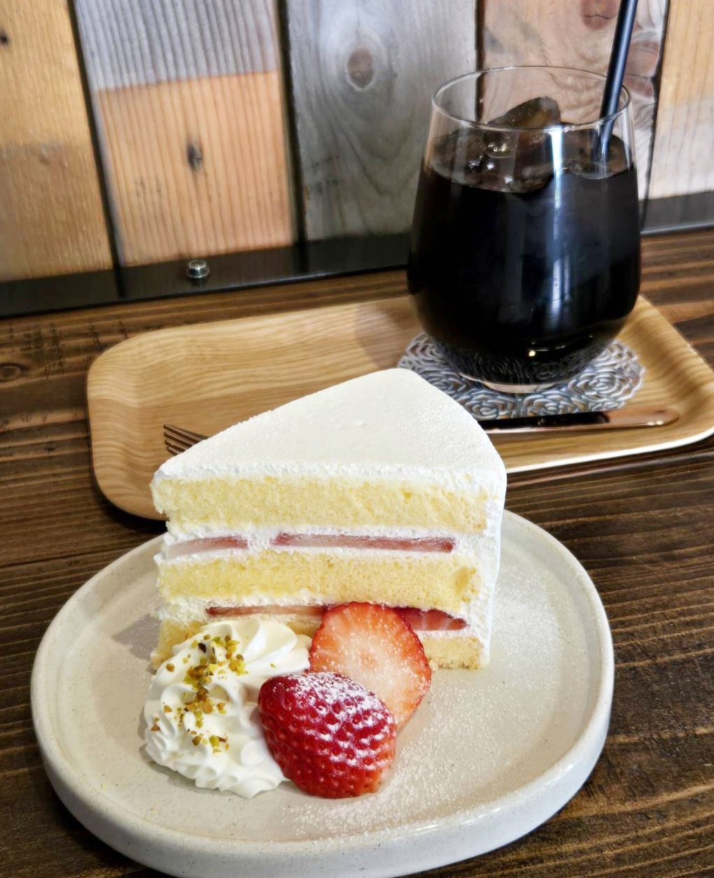 今回はいちごショートとアイスコーヒーをCHOICE。ショーケース内ではデコレーションされていない状態で、提供時に仕上げの盛り付けをするというこだわり。ビジュアルも写真映えする美しさです。甘さ控え目でふわっとしたクリームに、これまたふわっとしたしっとり柔らかなスポンジ。いちごもジューシーで全ての相性がカッチリとハマっています。