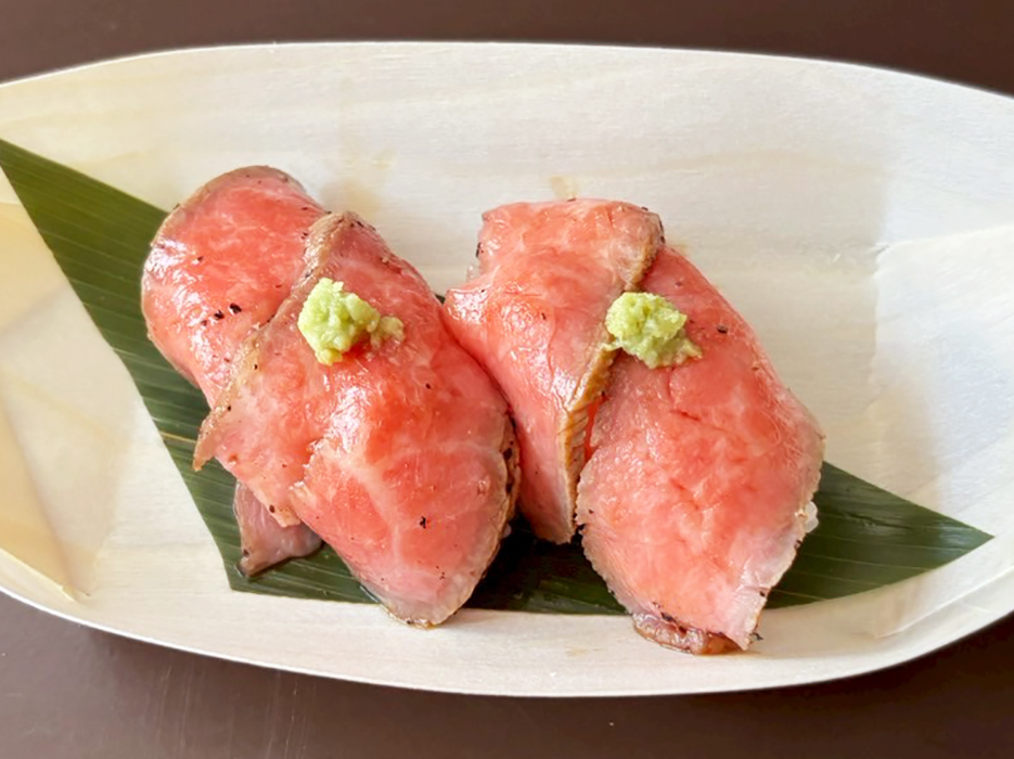 源氏和牛を気軽に味わうことのできる肉寿司。2貫セットで、タレまたは塩のどちらかからその時の気分でチョイスしてみて。秋になったら食べ歩き用にテイクアウトもオススメ。