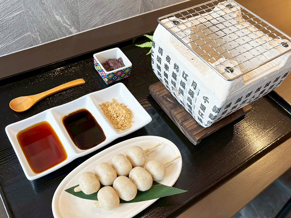個々の席で自ら焼き上げる体験型。2本の玄米団子がセットになっており、じっくりと焼いていくのが癒しの時間に。みたらし、黒蜜、きな粉、あんこを好きな組み合わせで付けていただいて。