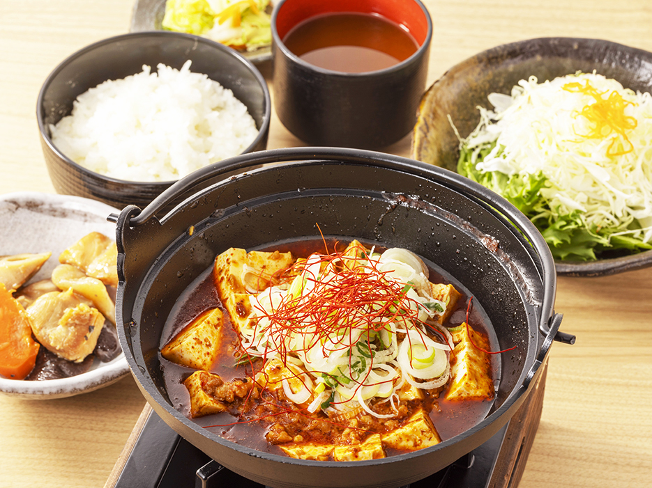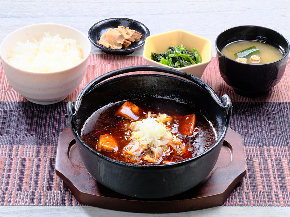 花椒と醤のコクが際立つ本格中華麻婆豆富。最後まで美味しくいただけるアツアツの鉄鍋での提供がポイント。サウナ後にもうひと汗いかがですか?