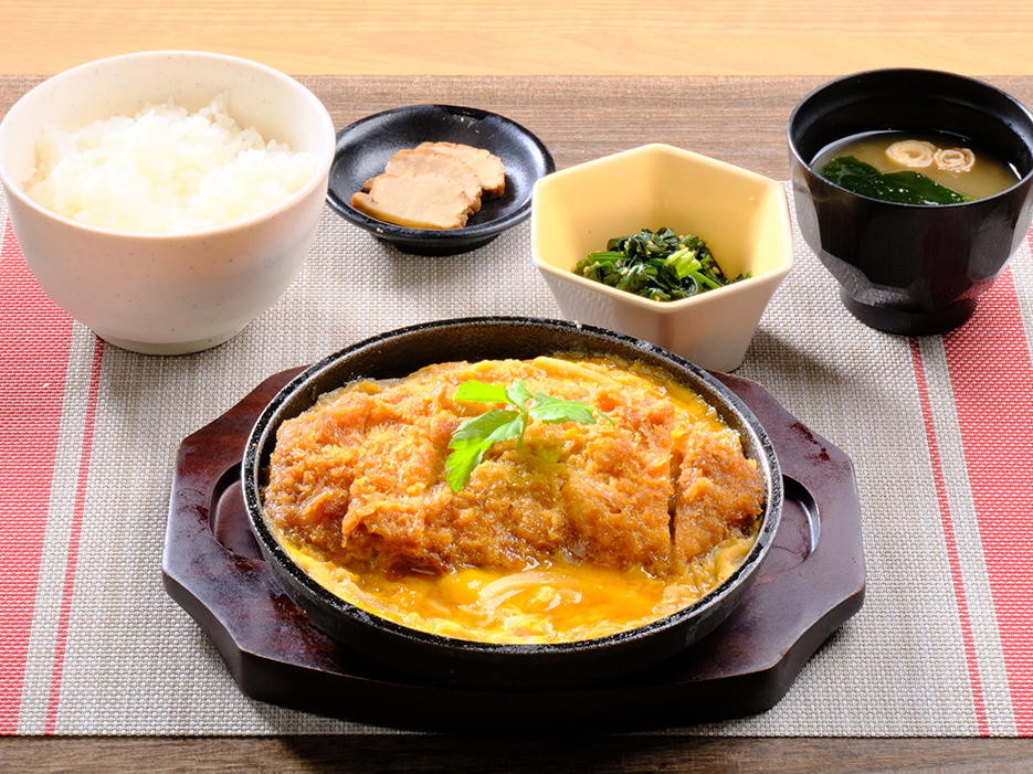 低温熟成された豚肉のロースかつをとろふわの卵でくるんだ、人気の定食。三元豚を揚げたてで美味しくいただけます。数品の小鉢も箸休めにどうぞ。