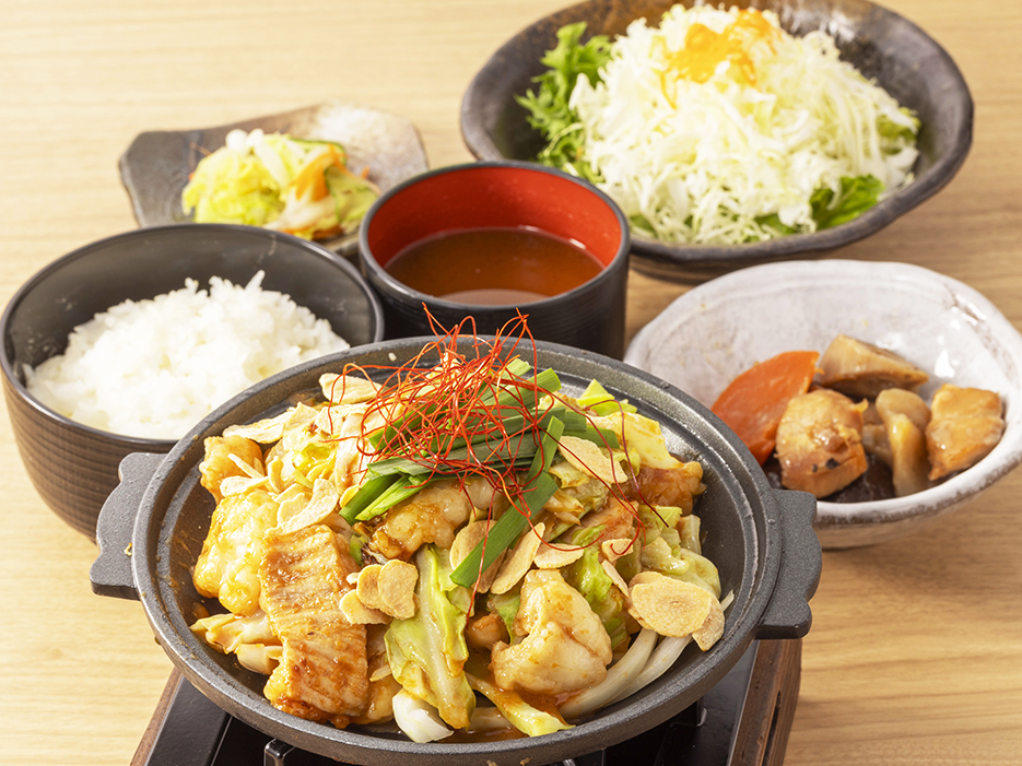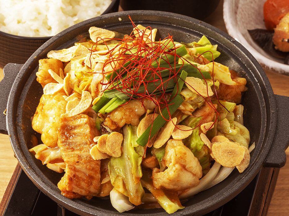 人気No.1を争う大人気メニュー。牛ホルモンとたっぷりの野菜を、おろしたてのニンニク味噌だれで炒めていてスタミナ抜群! まだまだ暑いこの季節にもぴったりで、おなかも大満足。