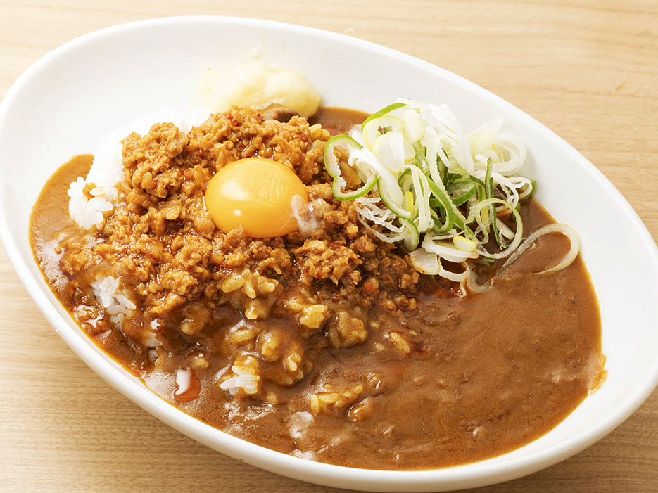 自慢のオリジナルカレーの上から台湾ピリ辛ミンチをドドンと乗せたオリジナルコラボ商品。トッピングの生たまごとおろしにんにくを混ぜて食べれば、美味さ10倍、元気100倍!!