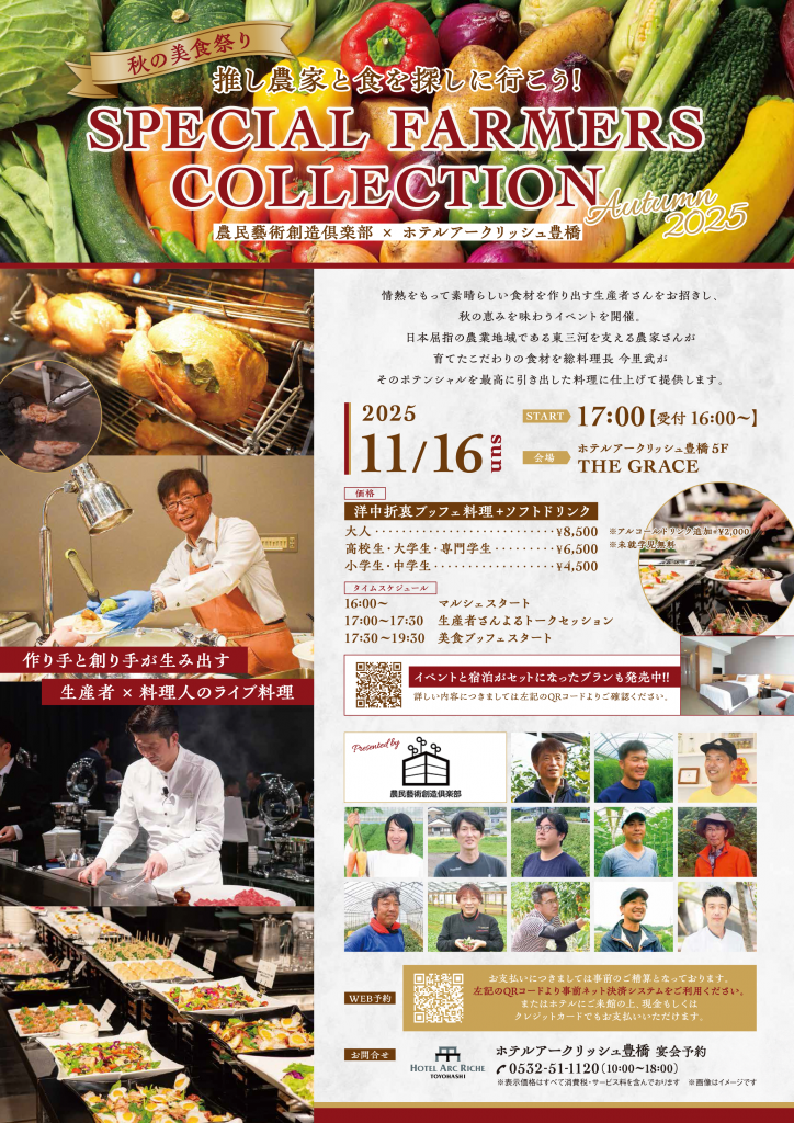 春に続き今年二回目の開催となるSPECIAL FARMERS COLLECTION。開業17年目を迎えるホテルアークリッシュ豊橋で、卓越した技術や経験を持ち合わせた農民藝術創造倶楽部とコラボレーション。食材の魅力を引き出したこの日限りの特別な料理にして、総料理長・今里武が提供してくれます。食事前には生産者の方によるトークセッションを開催。普段聞くことができない食材への情熱や農業の未来など、様々な話を聞ける貴重な機会! 東三河の農家さんが真心を込めて作った生産物を使った料理を、家族や友人など大切な人たちとストーリーと一緒に味わって。