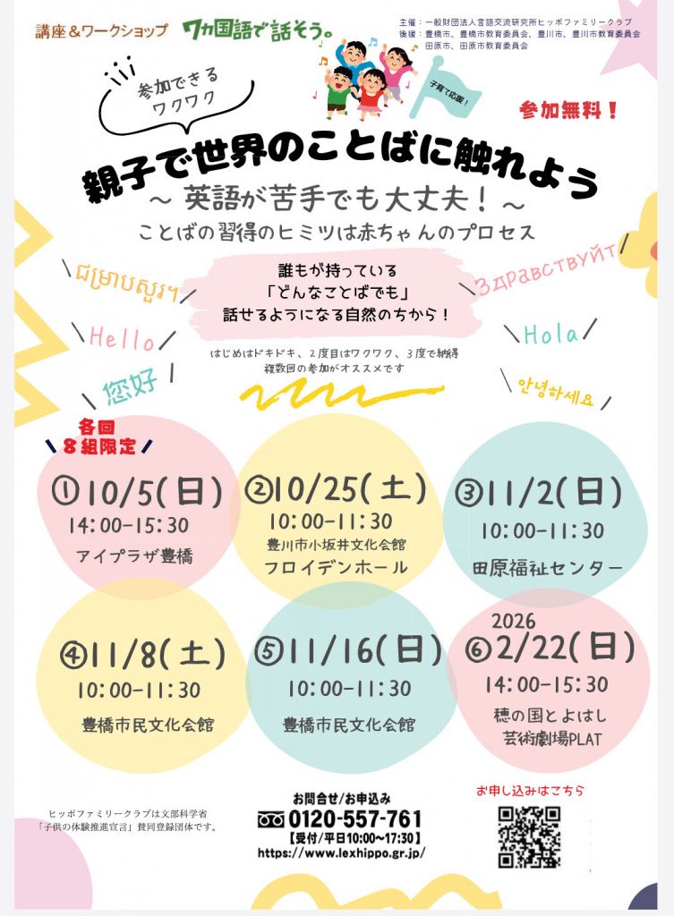 英語が苦手でも大丈夫! ことばの習得のヒミツは赤ちゃんの発達プロセスに。世界のことばを真似したり、さまざまな国の音楽やゲーム、ダンスなどで楽しく多言語の体験をしてみよう。はじめはドキドキ、2度目はワクワク、3度目で納得。複数回の参加がおススメです!