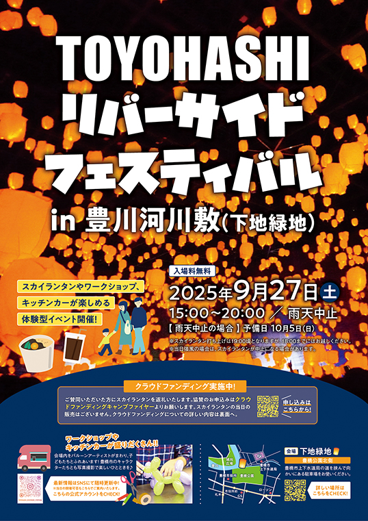 豊橋の魅力を照らし出す希望の光! スカイランタンフェス「TOYOHASHI リバーサイドフェスティバル」。ランタンの点灯・打上げの他、ワークショップやキッチンカーが盛りたくさんのナイトマーケットで楽しい夏の夜のひとときを過ごしてみては。現在、クラファンで支援者募集中。