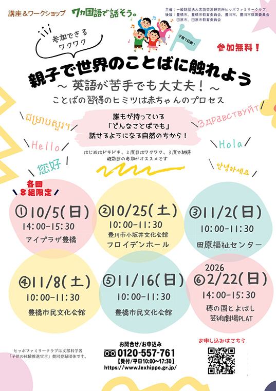 英語が苦手でも大丈夫! ことばの習得のヒミツは赤ちゃんの発達プロセスに。世界のことばを真似したり、さまざまな国の音楽やゲーム、ダンスなどで楽しく多言語の体験をしてみよう。その他、多言語で子育てしてきたお話も聞けるよ。